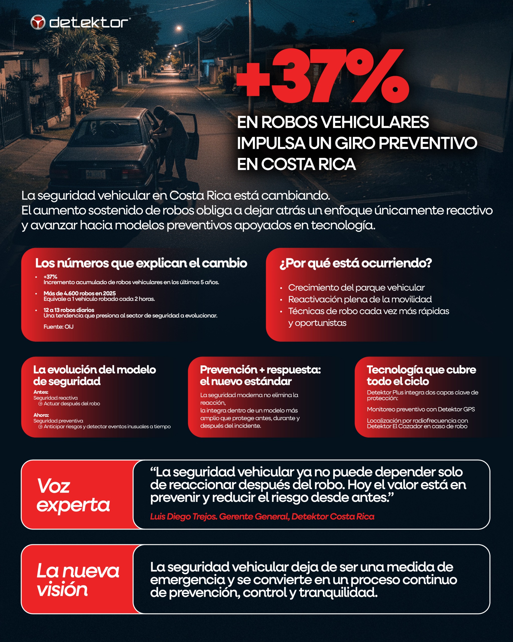 “Hoy la seguridad vehicular ya no puede depender únicamente de la reacción posterior al robo. El mercado está migrando hacia esquemas que combinan prevención y respuesta, donde la tecnología juega un papel central”, explica Luis Diego Trejos, Gerente General de Detektor Costa Rica.