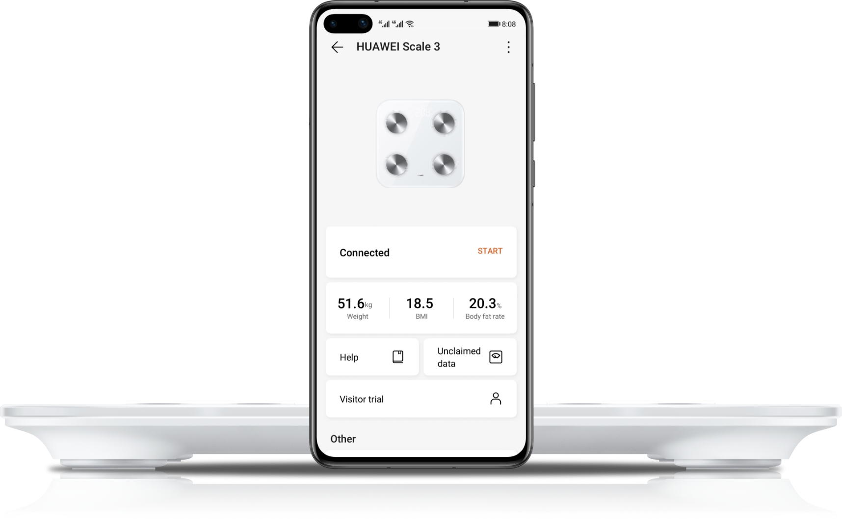 Al sacarla de la caja es necesario conectarla a la aplicación Huawei Health, a través de la cual vas a poder observar los distintos valores en rubros como porcentaje de agua corporal, densidad mineral ósea, tasa de grasa corporal, índice de masa corporal, y desde luego el peso. Justamente la aplicación te va a indicar cuántos kilos debes perder para alcanzar tus objetivos de acuerdo a tu altura, y algunas sugerencias para lograrlo.